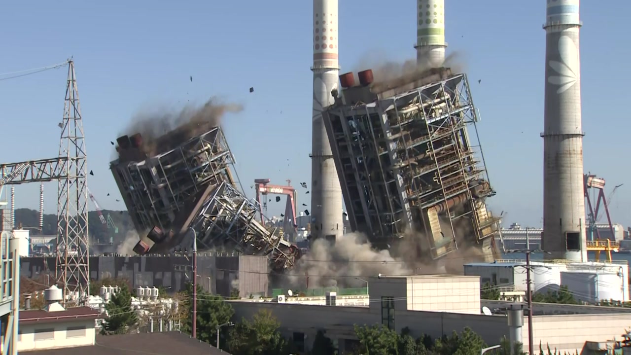 조금 전에 화력발전소 보일러타워 4호기와 6호기가 무너지는 장면을, 발파해서 해체되는 장면을 함께 보셨습니다.