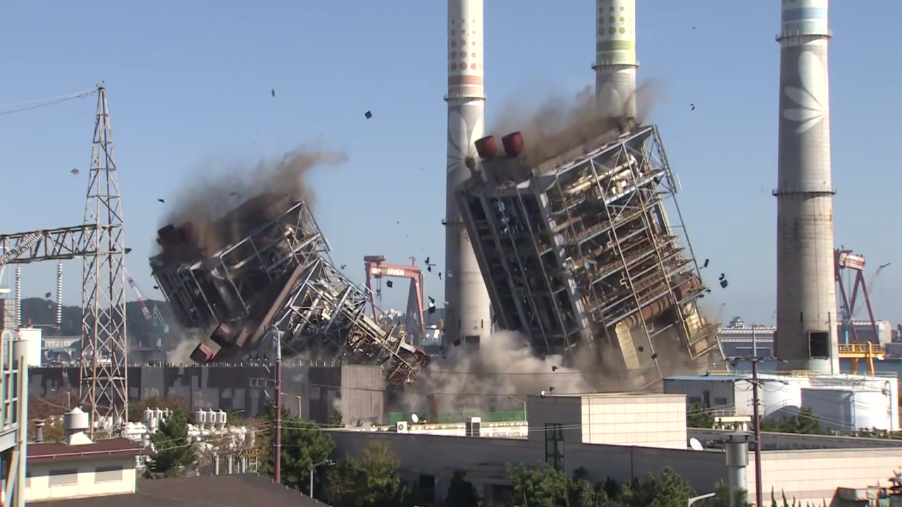 울산 화력발전소 붕괴 사고로 무너진 5호기 양옆에 있는 4·6호기 발파 해체가 성공적으로 이뤄졌습니다.