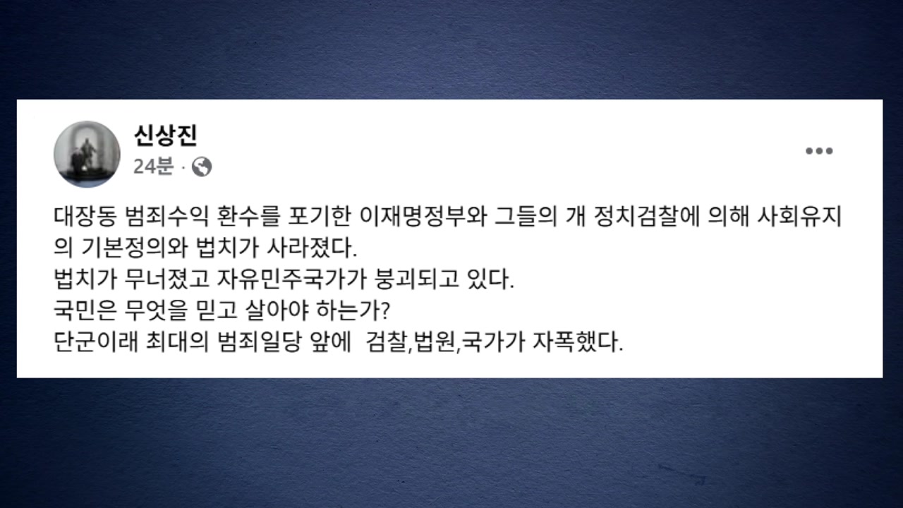 신 시장은 "정치검찰에 의해 사회유지의 기본정의와 법치가 사라졌다"며 "단군 이래 최대의 범죄 일당 앞에 검찰, 법원, 국가가 자폭했다"고 덧붙였습니다.