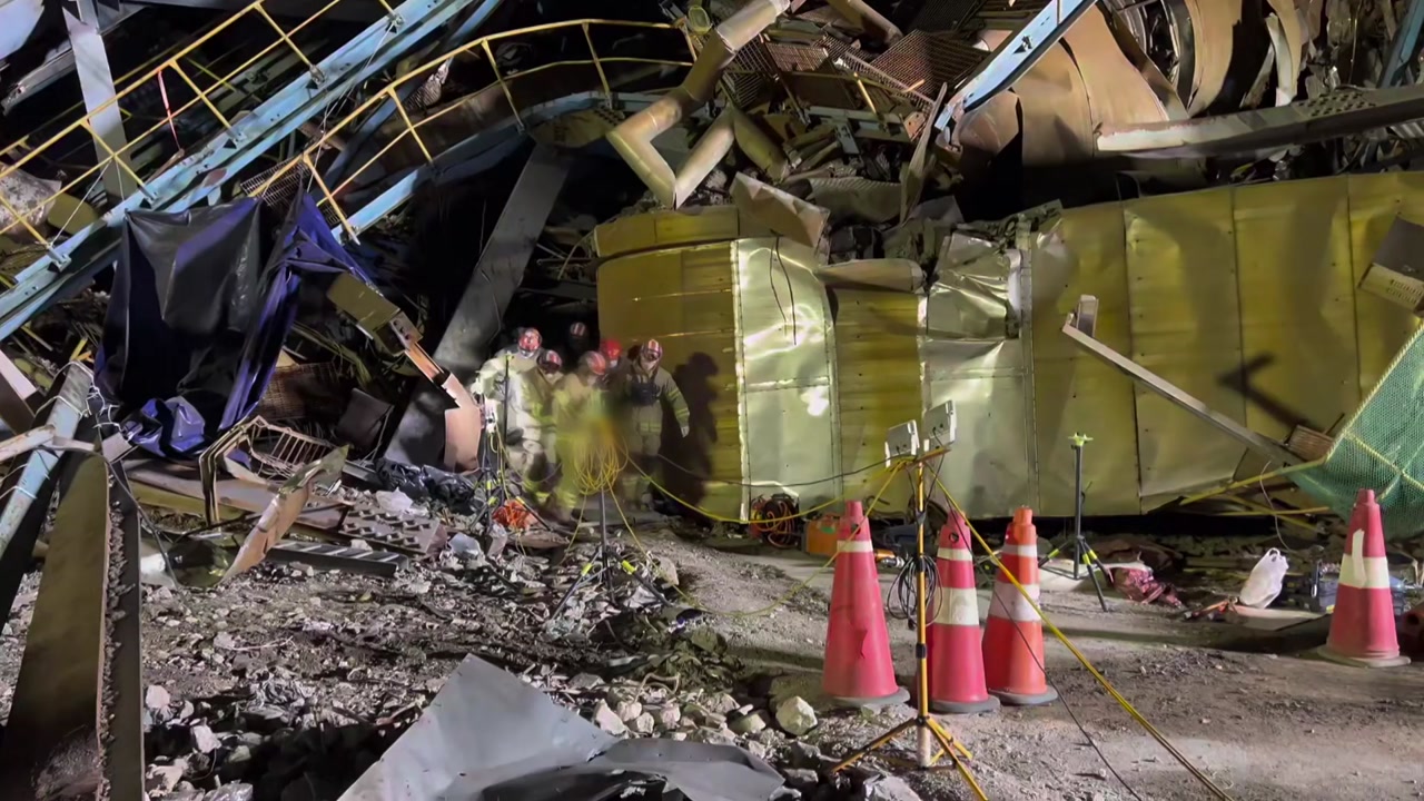 무너진 잔해를 들어 올리고, 지지대로 공간을 확보한 뒤 구조대원들이 뒤엉킨 자재를 잘라내며 작업자 구조를 진행합니다.