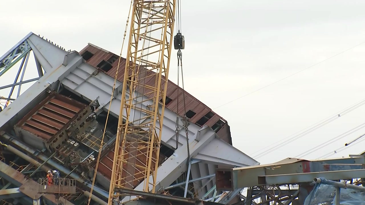 네, 지금 제 뒤로 무너진 구조물 옆에 접근한 노란색 크레인이 보이는데요.