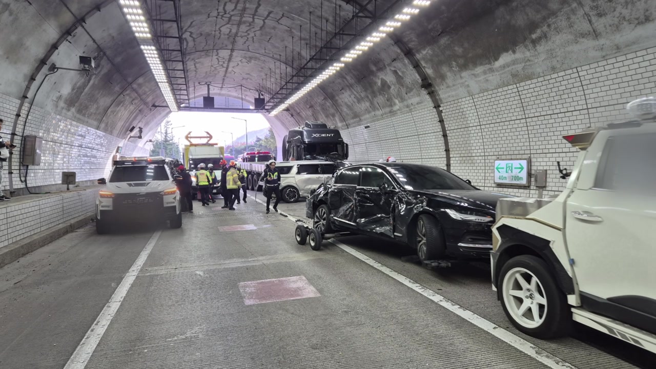 어제(12일) 오후 2시 10분쯤 충남 공주 천안논산고속도로 천안 방향 차령터널 안에서 50대 A 씨가 몰던 25톤 화물차가 앞서가던 승합차 등 8대를 연달아 추돌했습니다.