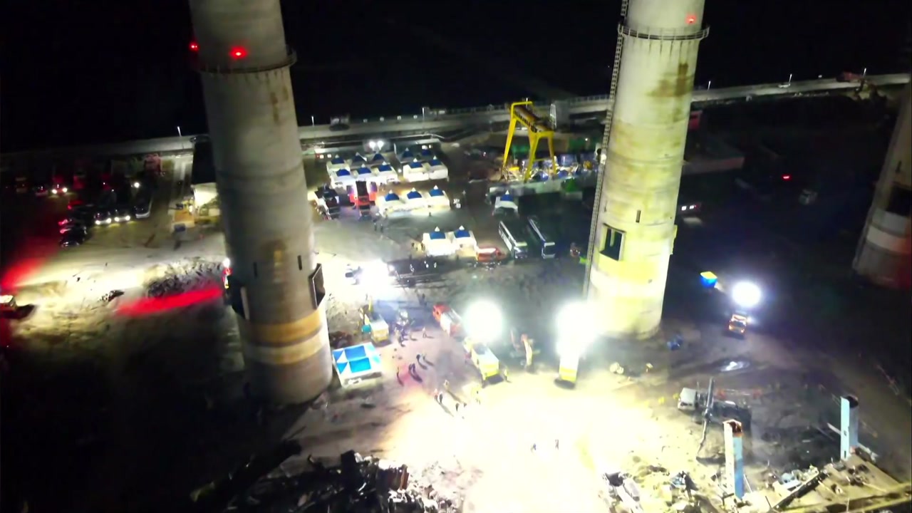 구조대가 들것을 들고 무너진 보일러 타워 잔해 속에서 걸어 나옵니다.