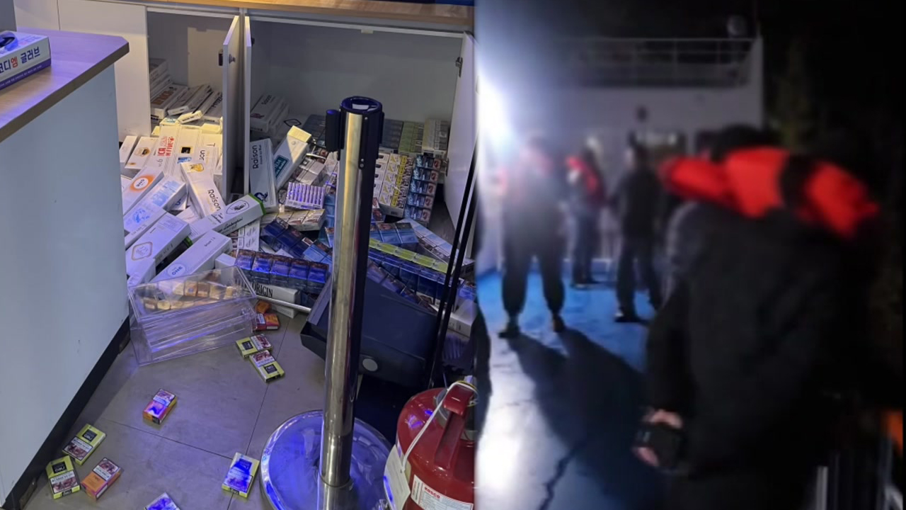 매점 판매대가 떨어져 있고, 물건들은 어지럽게 흩어졌습니다.