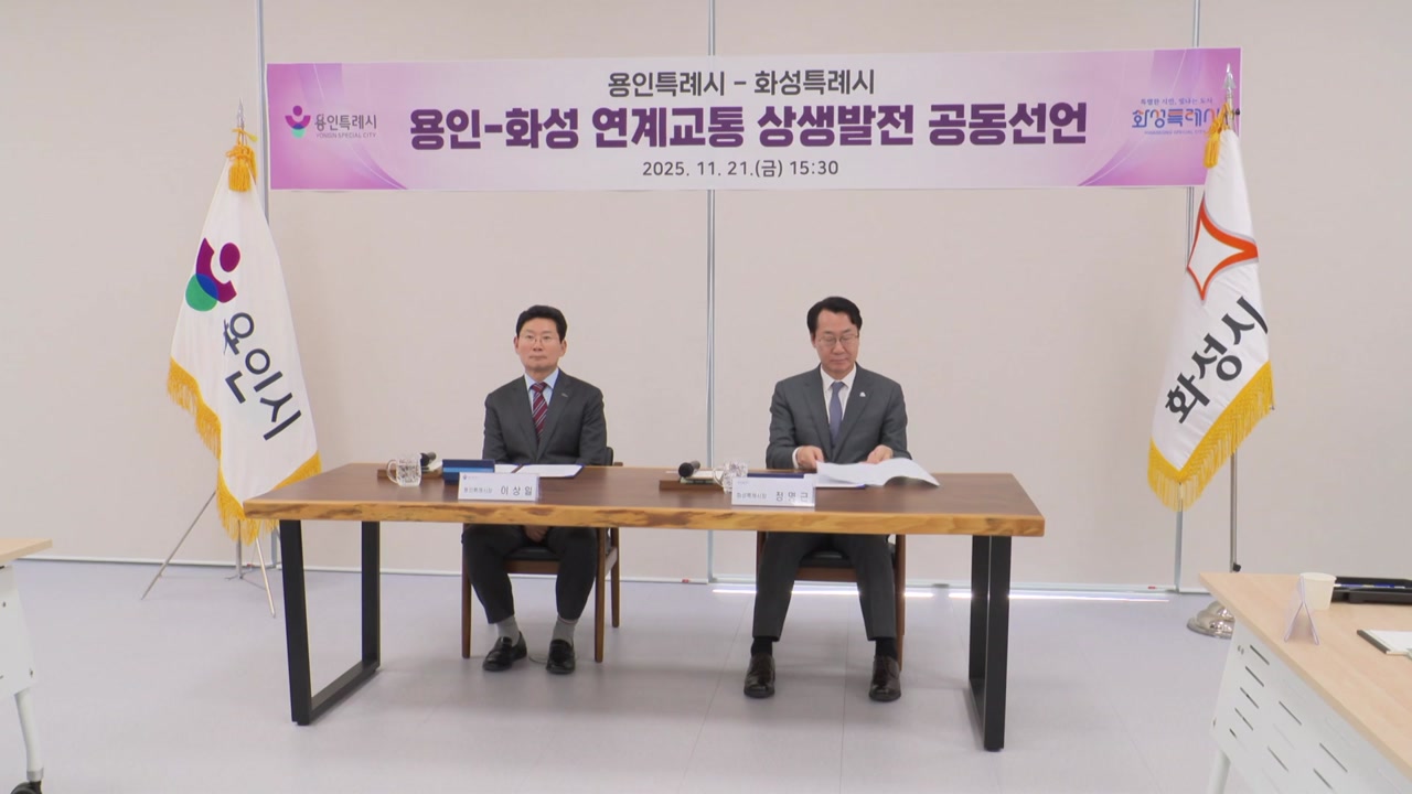 용인시와 화성시가 두 도시 사이 교통 편의 증진과 반도체 산업 경쟁력 강화 등을 위한 '용인~화성 간 연계 교통 상생발전 공동선언문'에 서명했습니다.