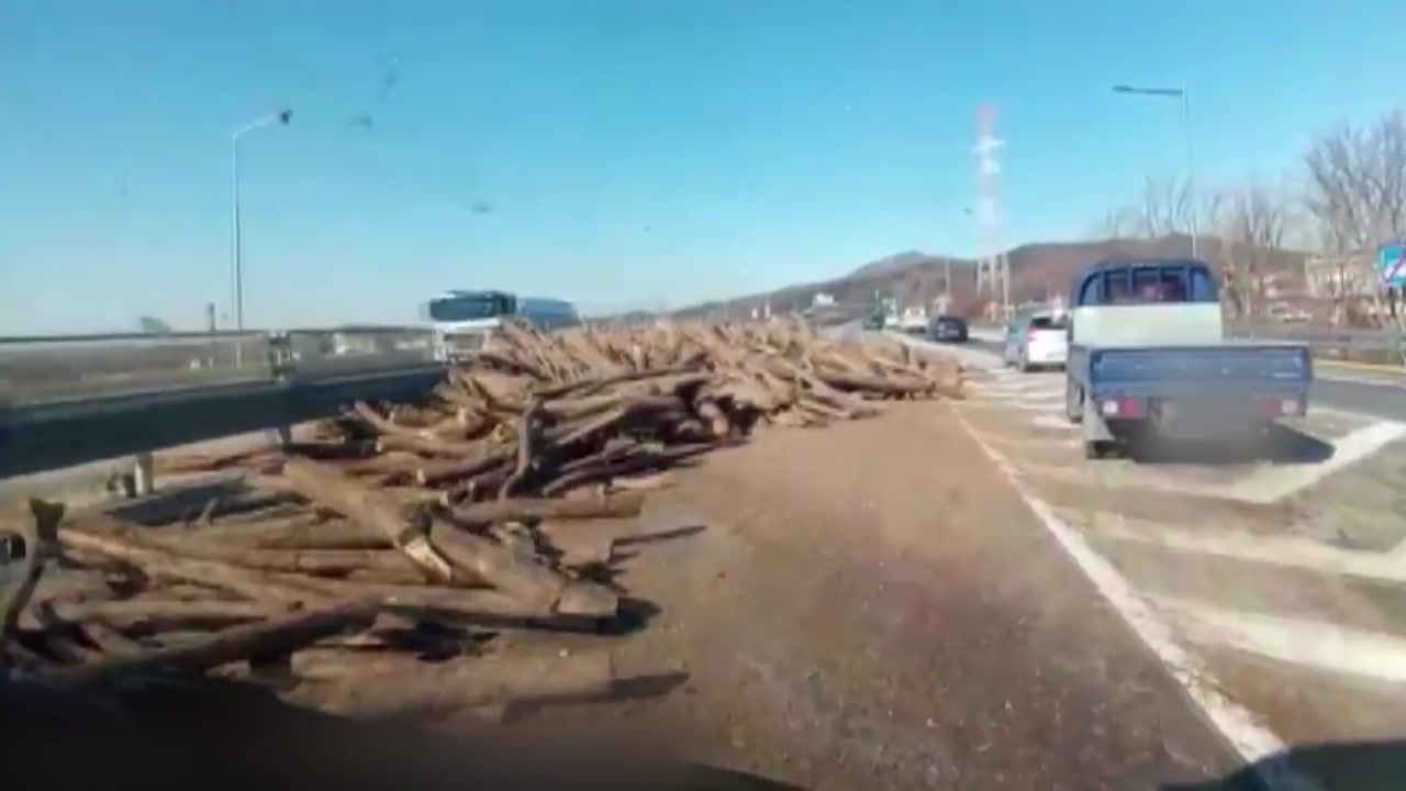 이 사고로 다친 사람은 없었고 화물차 적재함에 실려있던 벌목한 나무들이 도로 위로 쏟아져 5시간 동안 차량 통행에 어려움을 겪었습니다.