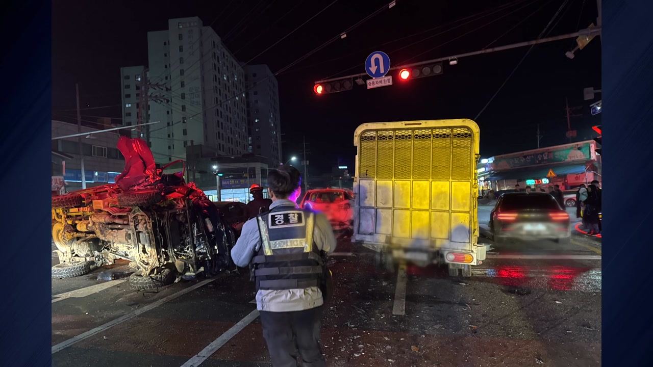 어젯밤(12일) 9시 20분쯤 전남 무안군 청계면 목포대 앞 도로에서 50대 남성 A 씨가 몰던 화물차가 앞서 가던 차를 들이받았습니다.