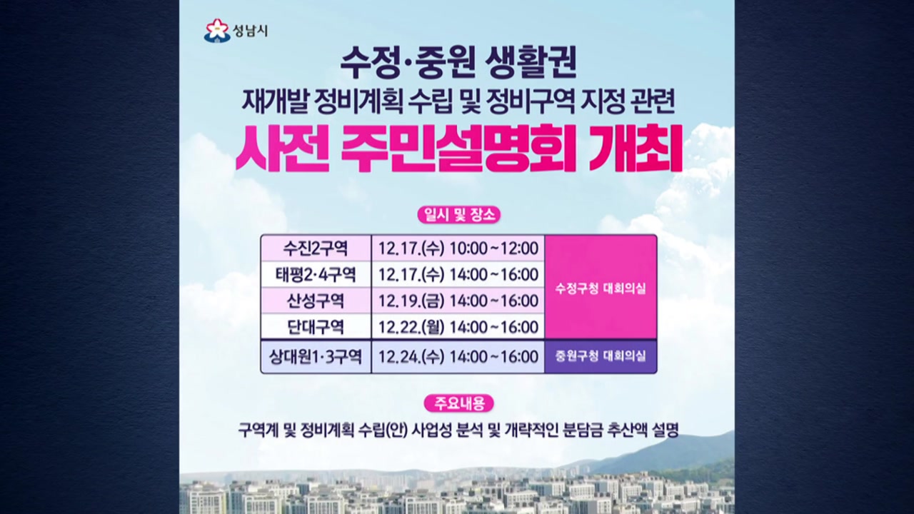 성남시가 오는 17일 수진2구역을 시작으로, 수정·중원 생활권 재개발 대상 구역 5곳에 대한 주민설명회를 순차적으로 개최합니다.
