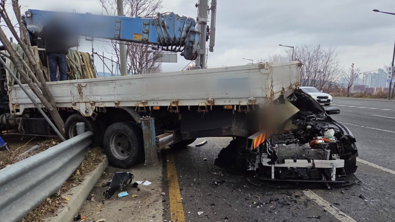 검은색 승용차가 대형 작업차 밑으로 들어가 있습니다.