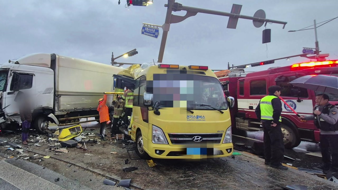 오늘(23일) 오후 4시 반쯤 전북 김제시 공덕면 존걸교차로 인근에서 초등학교 통학버스와 화물차가 부딪쳤습니다.