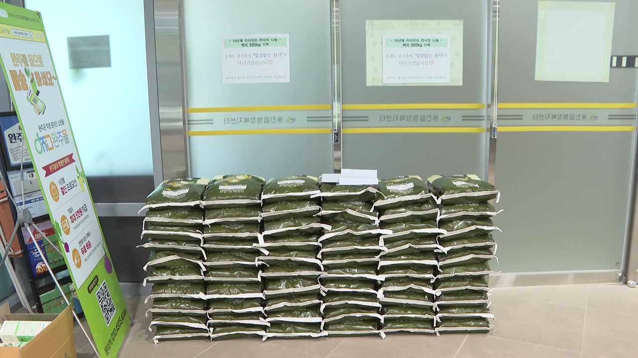 완주군에 따르면 지난 26일 오전 용진읍 행정복지센터 앞에 10㎏짜리 백미 60포대가 놓여있는 것을 출근하던 직원이 발견했습니다.