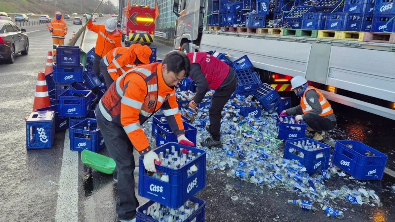 인명 피해나 추가 사고가 발생하지는 않았지만, 상자 320개 담겨 있던 맥주병이 대부분 깨져 일대 교통이 혼잡을 빚었습니다.