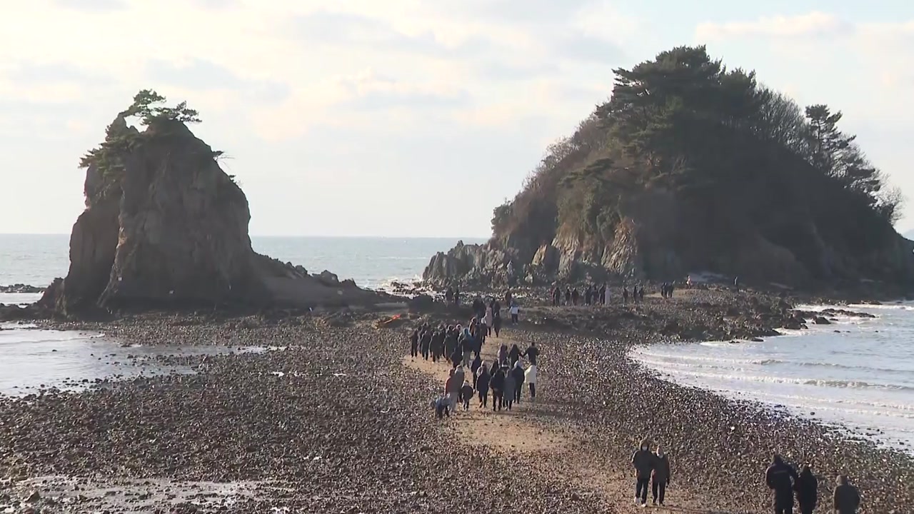 바닷물이 서서히 빠지면서 생긴 길을 따라 해넘이를 가까이서 보려는 관광객들이 바위 앞까지 걸어가는 모습도 볼 수 있습니다.