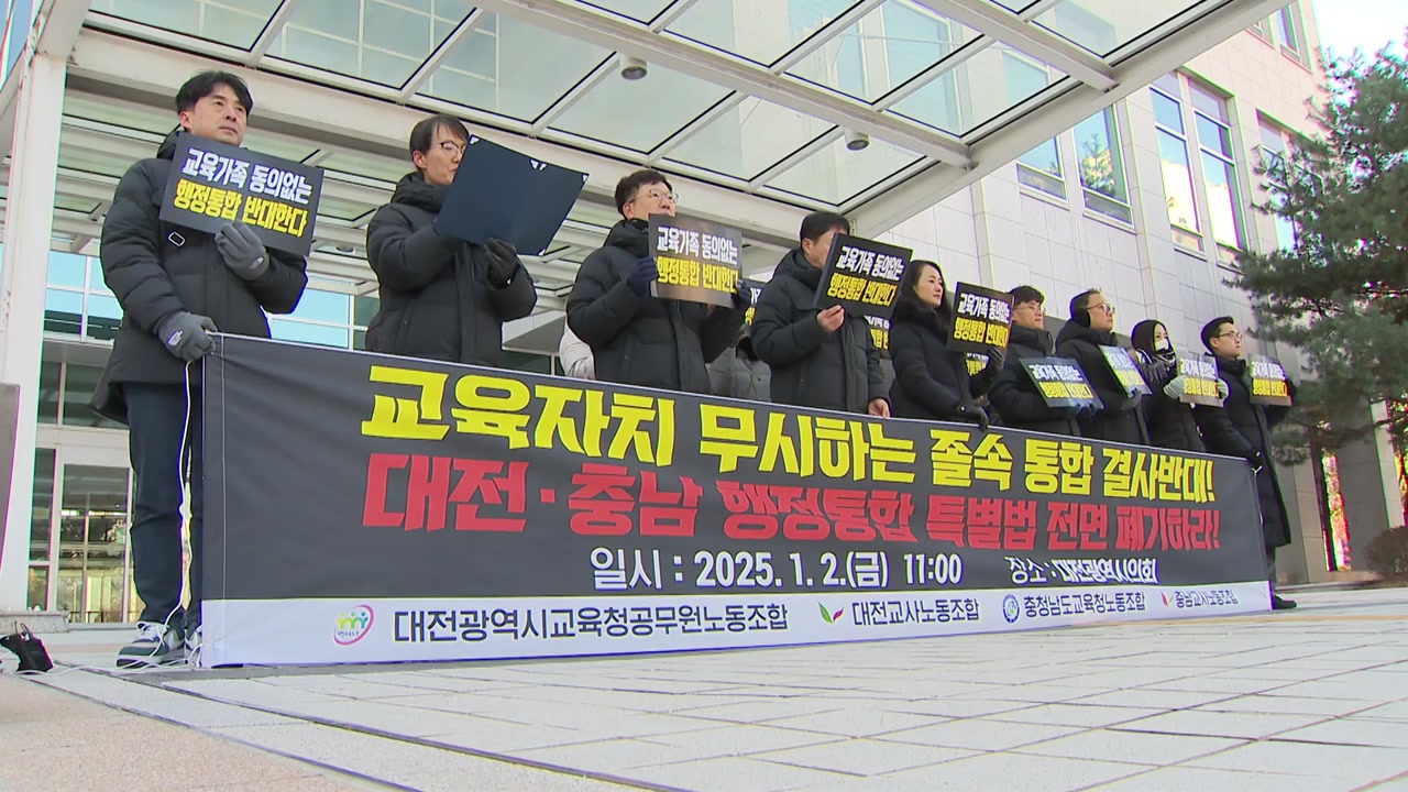 대전·충남 지역 교육청·교사 노조는 대전시청 앞에서 기자회견을 열고 "교육의 자주성을 짓밟고 시·도민을 기만하는 대전·충남 졸속 행정통합을 강력히 규탄한다"고 밝혔습니다.