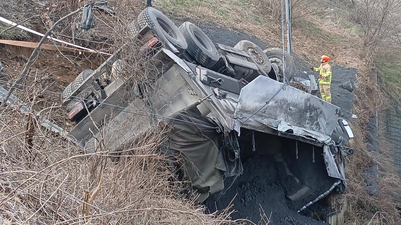 경찰은 덤프트럭이 급회전 구간에서 적재함에 실려있던 석탄재 무게를 버티지 못해 우측으로 쏠려 넘어진 것으로 보고 있습니다.