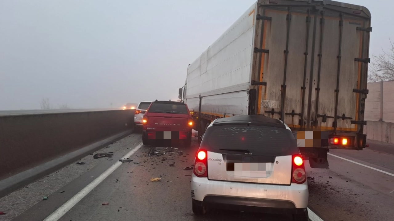 미세먼지와 안개가 자욱한 서해안고속도로 하행선 전북 부안 줄포나들목 인근에서 차량 4대가 잇따라 부딪혀 1명이 다쳤습니다.
