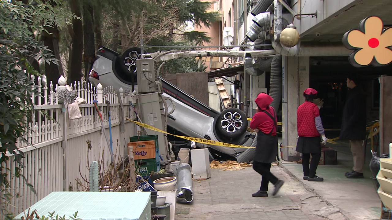 식당이 모여 있는 곳에 차가 떨어져 자칫 대형 인명피해로 번질 뻔했습니다.