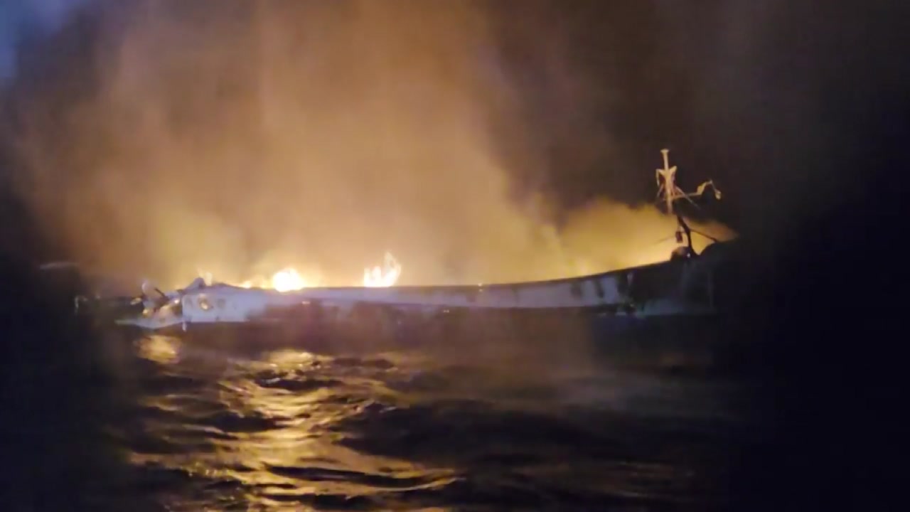 캄캄한 밤, 일렁이는 파도 위, 시뻘건 화염이 어선을 집어삼켰습니다.