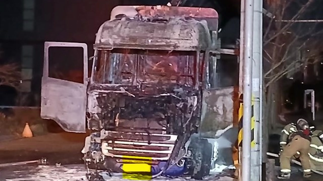오늘(30일) 새벽 2시 30분쯤 경북 구미시 공단동에서 주차돼 있던 대형 화물차에 불이 났습니다.