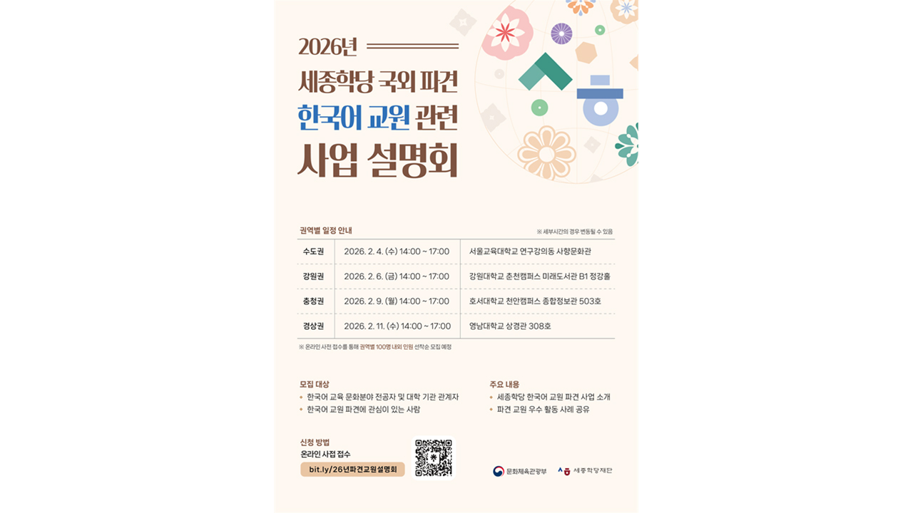 오는 2월 4일부터 11일까지 수도권, 강원권, 충청권, 경상권 등 전국 4개 권역에서 차례로 진행되는 이번 설명회에서는 국외 파견 한국어 교원 양성 사업의 주요 내용과 상세 선발 절차 등이 안내될 예정입니다.