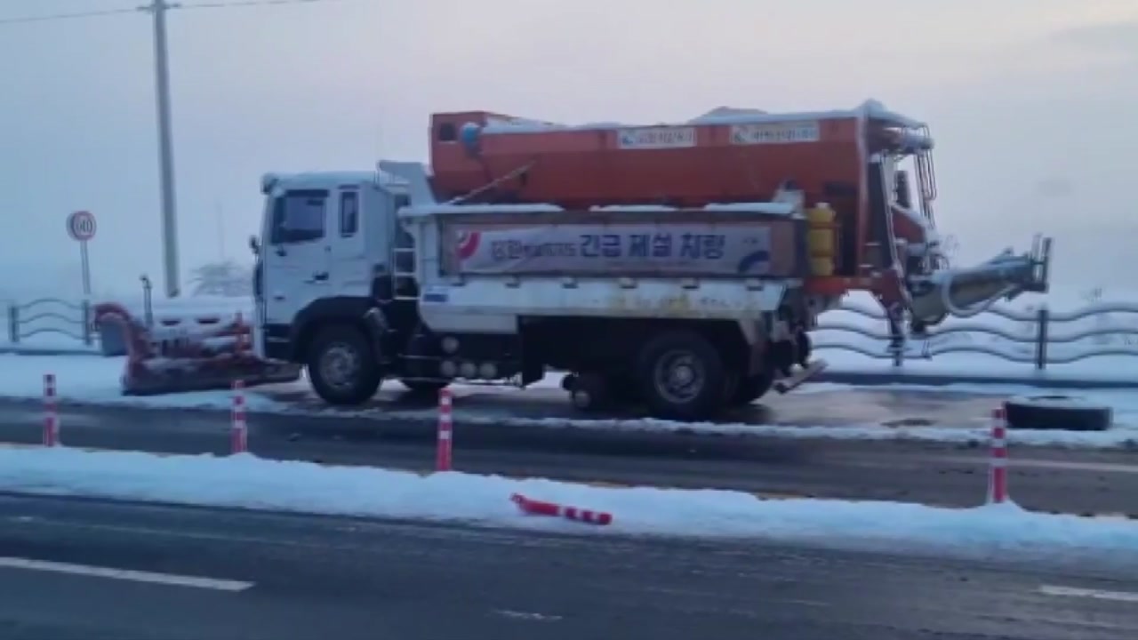 강원도 재난안전실은 사고 차량이 임차한 제설차량으로 오전 중 사고 차량 타이어 교체작업을 완료할 예정이라며, 제설 장비 안전점검에 주의하겠다고 밝혔습니다.