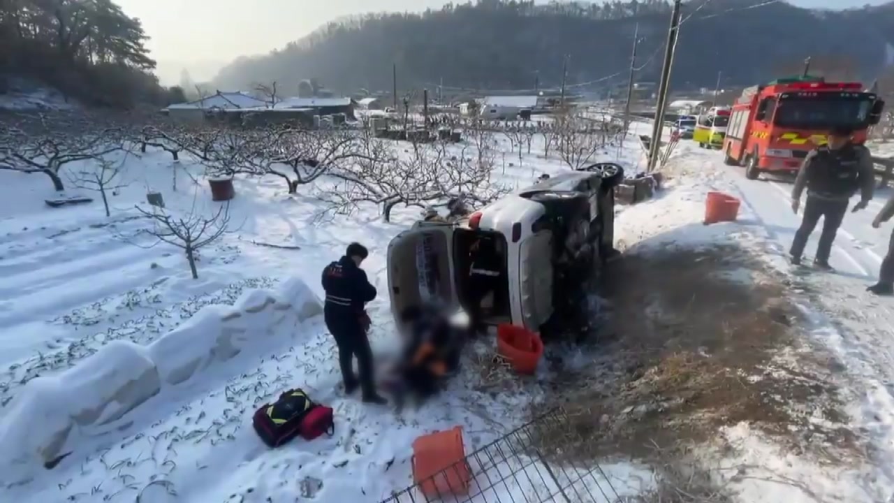 전남 화순에서도 도로를 달리던 차량이 빙판길에 미끄러지며 밭으로 추락해 2명이 병원으로 옮겨졌습니다.