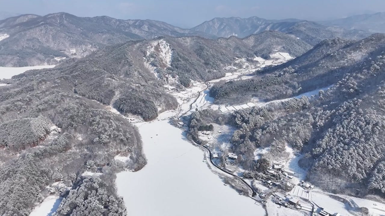 얼지 않은 댐 하류는 강물이 흐르지만, 얼어붙은 댐 상류엔 살포시 눈이 내려앉았습니다.