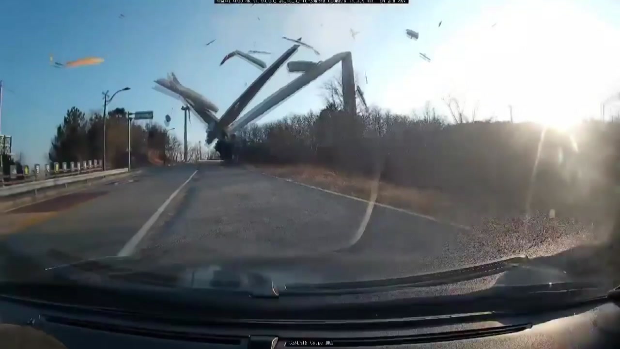 기둥 아래쪽이 부러지며 도로를 덮친 풍력발전기 잔해입니다.