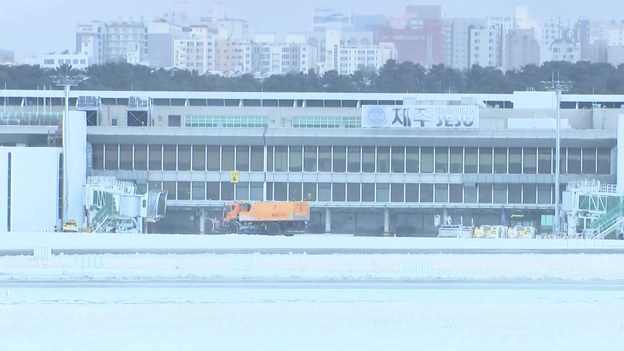 제주 지방에 내린 많은 눈으로 제주공항이 제설작업에 돌입하면서 활주로 운영이 중단됐습니다.