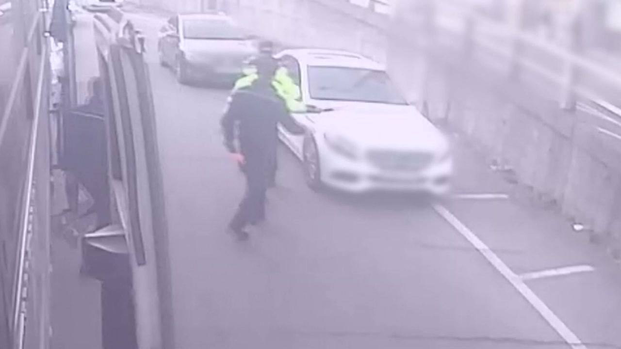 차량이 많은 터널 내에 차가 잠시 멈추자, 옆 차선 버스의 앞문이 활짝 열리고, 기동복을 입은 경찰관들이 기다렸다는 듯 우르르 나오며 순식간에 승용차를 에워쌉니다.
