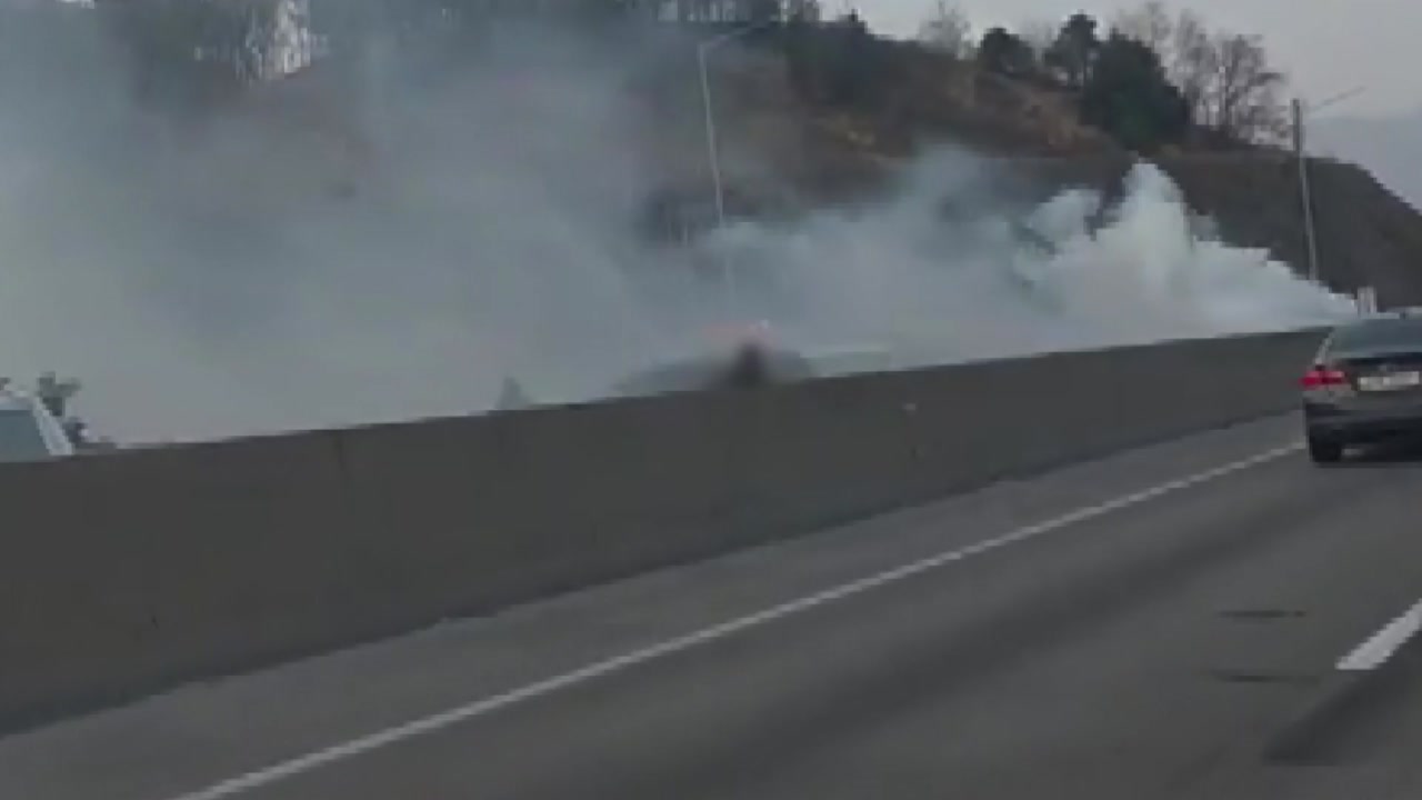 경찰과 소방 당국은 승용차가 중앙 분리대를 들이받고 엔진에서 불이 시작된 것으로 보고 정확한 경위를 조사하고 있습니다.