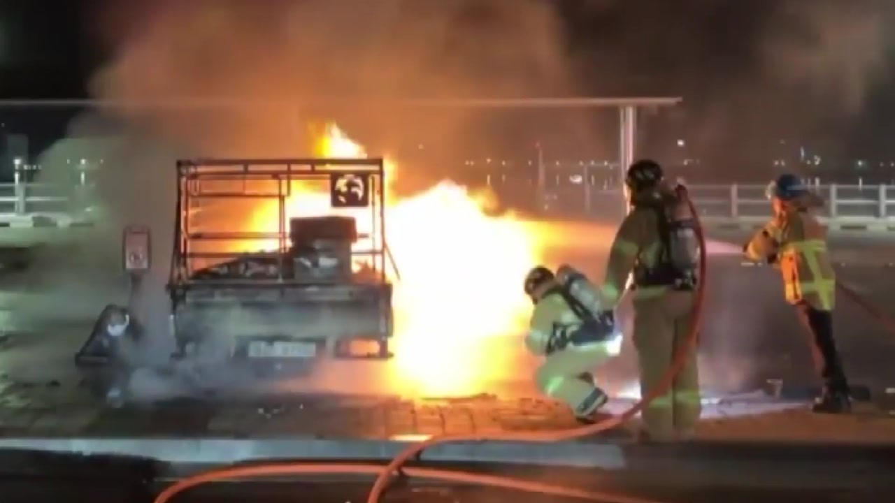 차량이 비어 있어 다친 사람은 없었지만 트럭이 모두 불에 타 소방 추산 570여만 원의 재산 피해가 발생했습니다.