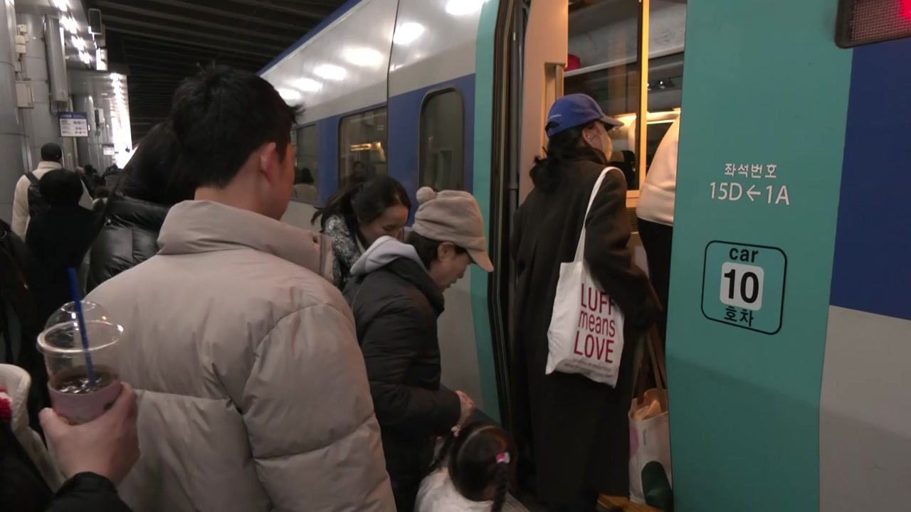일상으로 돌아가야 한다는 아쉬움이 탑승객들 얼굴에 묻어나지만, 고향에서 가져온 음식 꾸러미를 든 모습에서 행복함도 엿볼 수 있습니다.