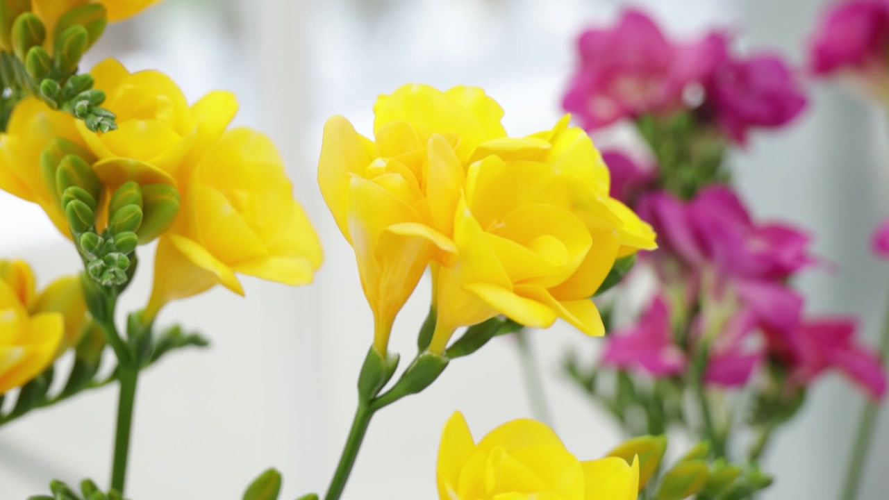 농촌진흥청은 국산 프리지어 품종의 보급을 확대하고 시장 경쟁력을 검증하기 위해 분홍색과 보라색 등 다양한 색상의 주력 품종 5종과 새로운 계통 10종을 선보이는 현장 평가회를 열었습니다.