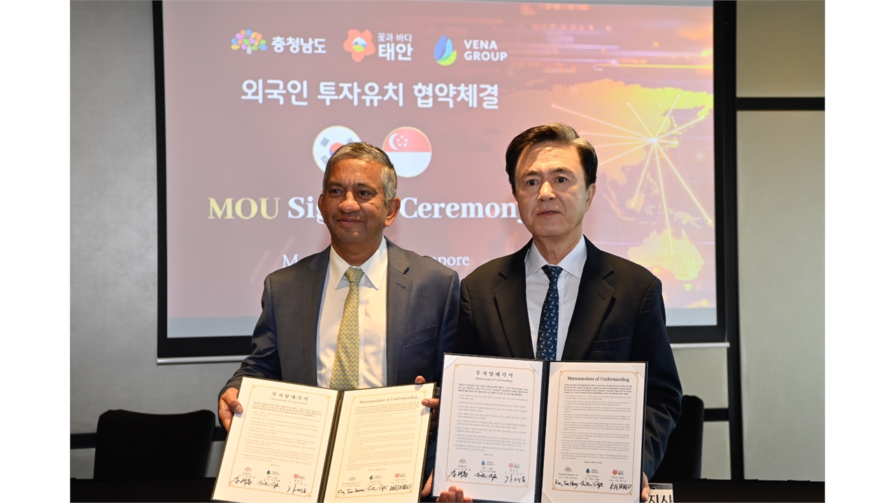 충청남도와 태안군이 싱가포르에서 아시아 태평양 최대 재생에너지 기업인 뷔나그룹과 1조 원 규모의 투자협약을 체결했습니다.