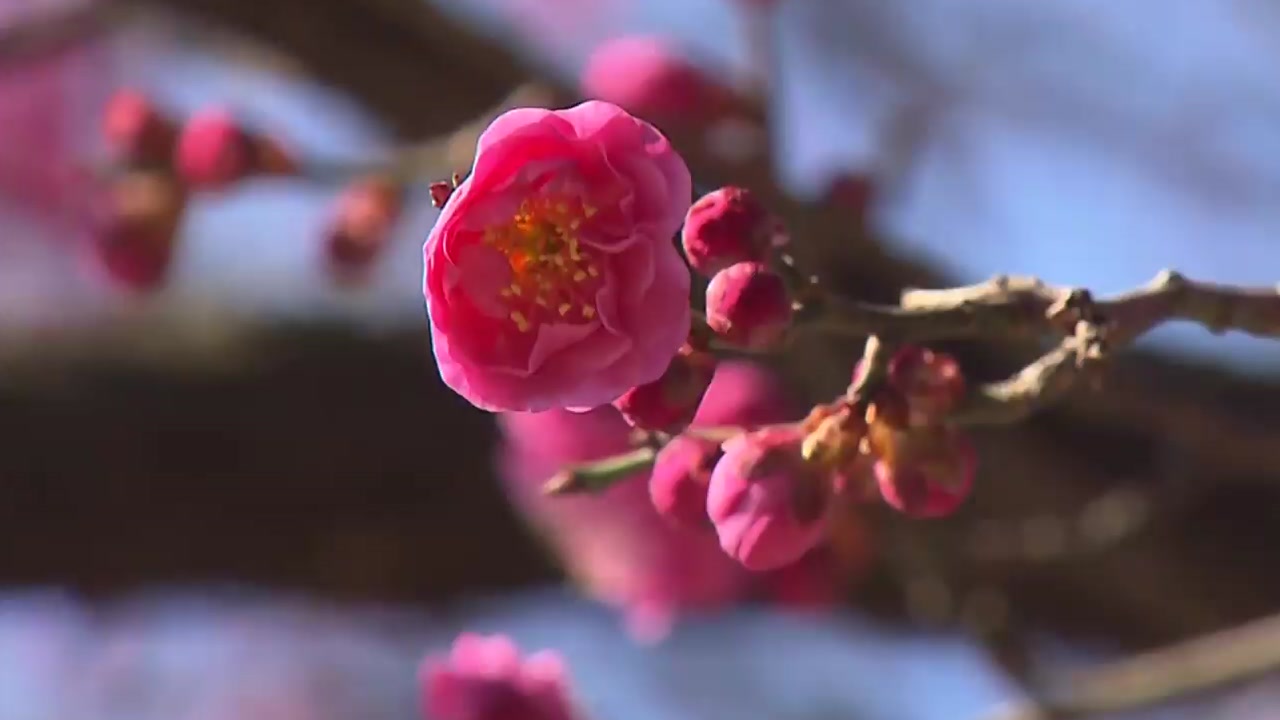 지금 제 뒤로 보이는 붉은 꽃이 바로 봄의 전령, 홍매화입니다.