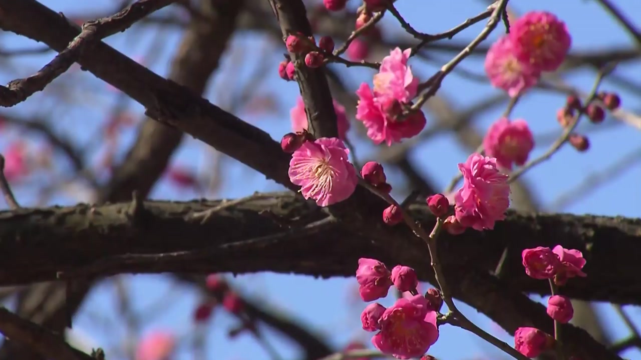지금 제 뒤로 보이는 붉은 꽃이 바로 봄의 전령, 홍매화입니다.