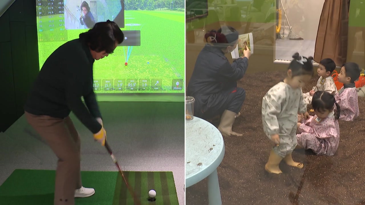 아이들이 흙 놀이에 빠져 있는 사이, 바로 위층에선 어르신들이 스크린 골프를 즐깁니다.