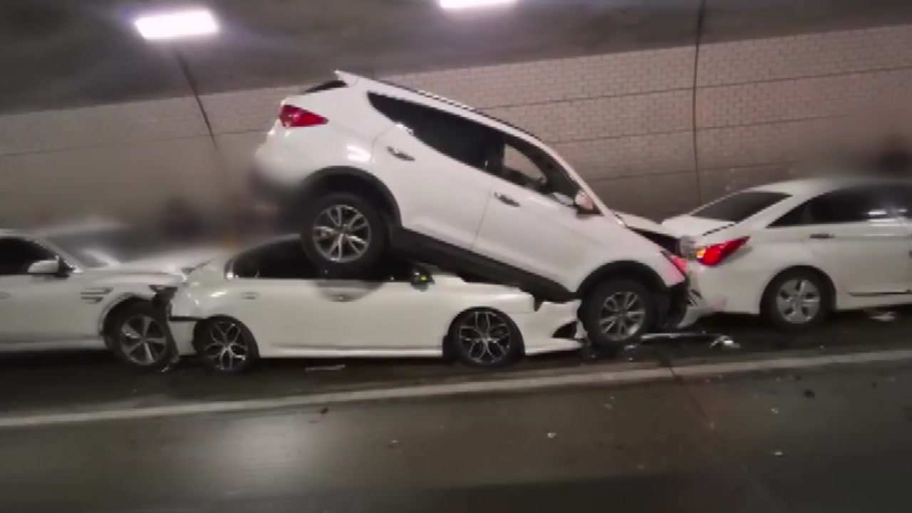 터널 안 거북이걸음을 하던 차들이 연쇄 추돌로 도미노처럼 겹쳐집니다.