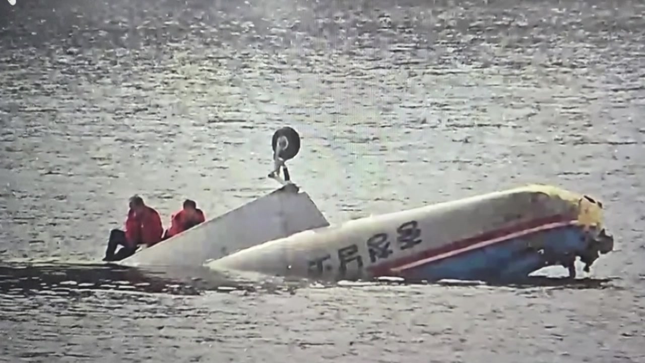 수면 위로 떠오른 헬기 바닥에 사람 두 명이 힘겨운 듯 버팁니다.