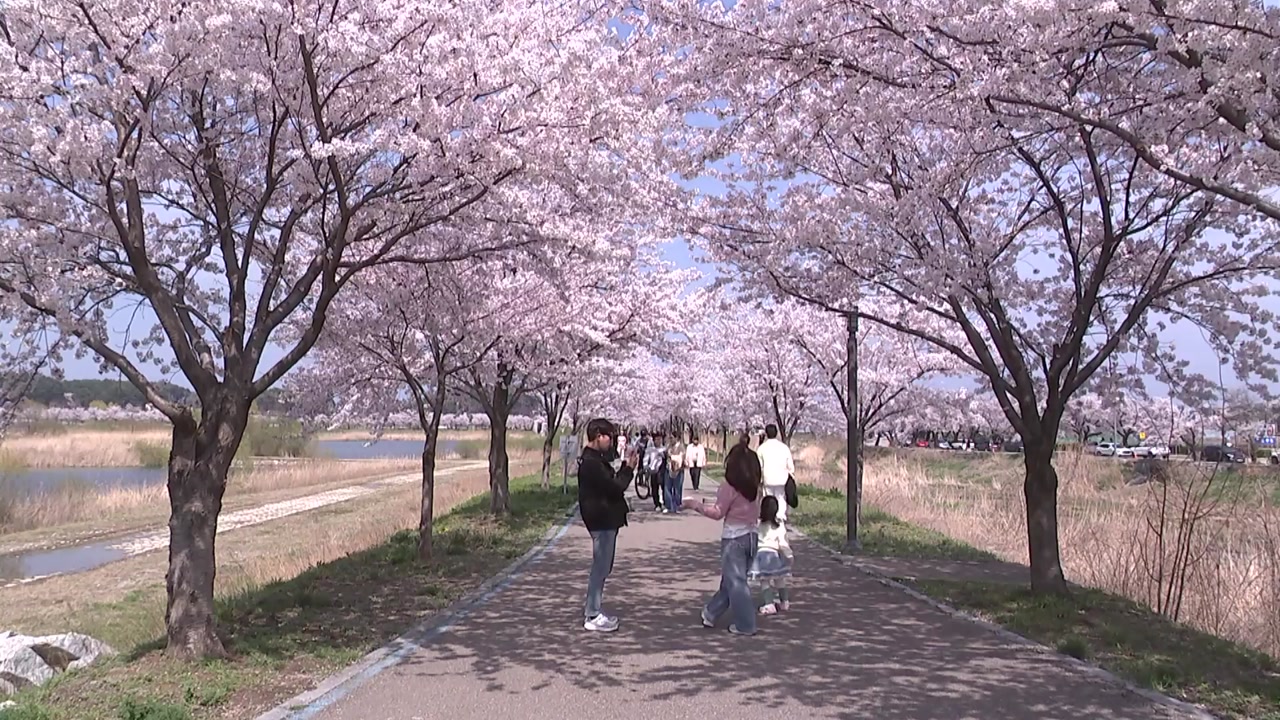 경포호 산책로가 연분홍빛 벚꽃 터널로 변했습니다.