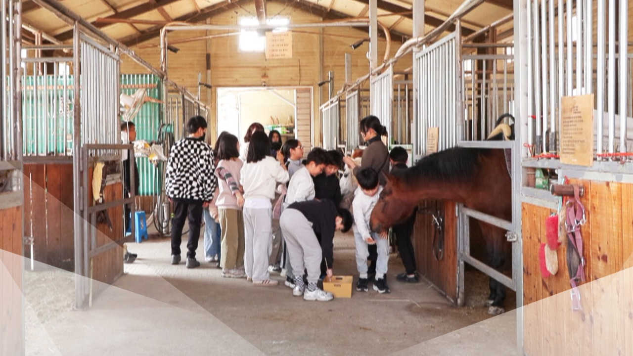 학생들이 조심스레 말을 쓰다듬고 먹이를 건네며 깊은 교감을 나눕니다.