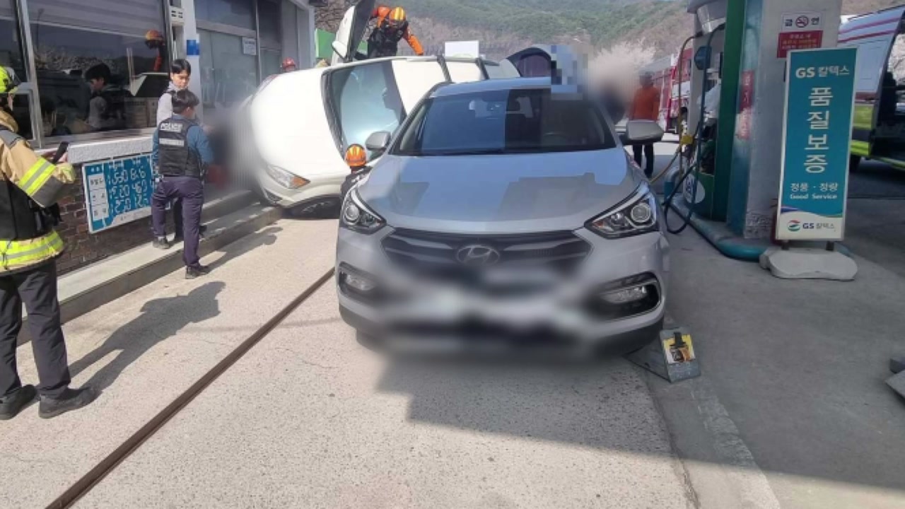 어제(11일) 오후 3시쯤 강원도 정선군에 있는 주유소에서 50대 A 씨가 몰던 승용차가 SUV 차량에 이어 주유소 사무실을 들이받은 뒤 전도됐습니다.