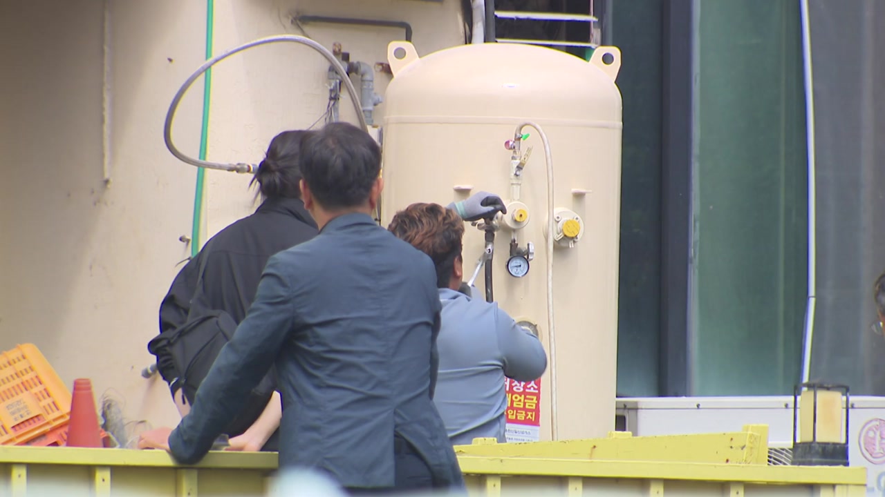 사고가 난 식당 외부의 대형 LP 가스통을 가스 업체 직원들이 점검합니다.