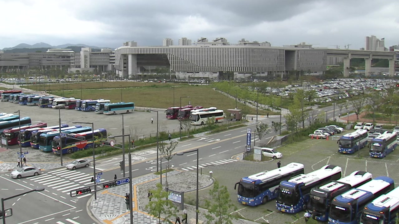 네, 제 뒤로 전세버스 여러 대가 세워져 있는 모습 보이실 것입니다.