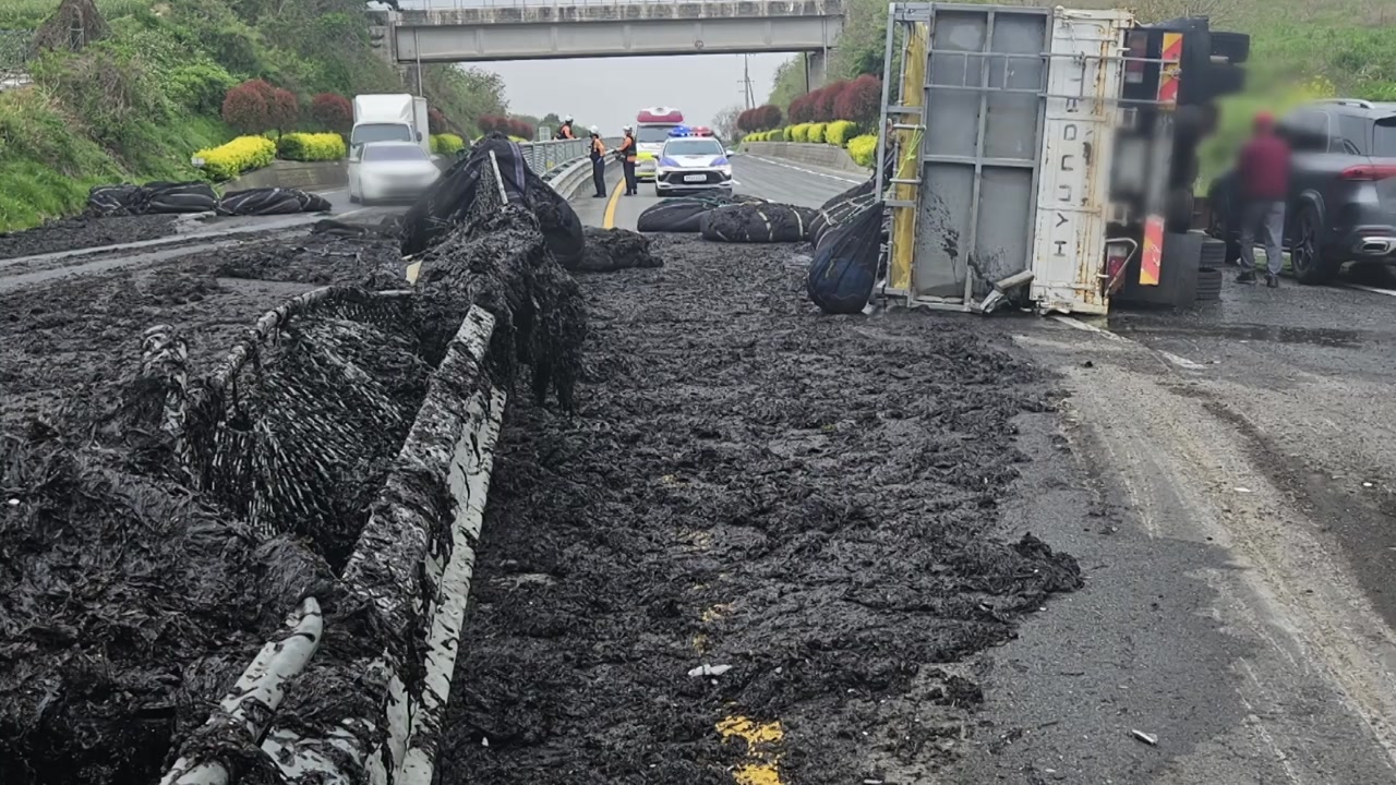 어제(20일) 오후 2시 반쯤 전남 해남군 도로에서 물김을 실은 대형 트럭이 전도됐습니다.
