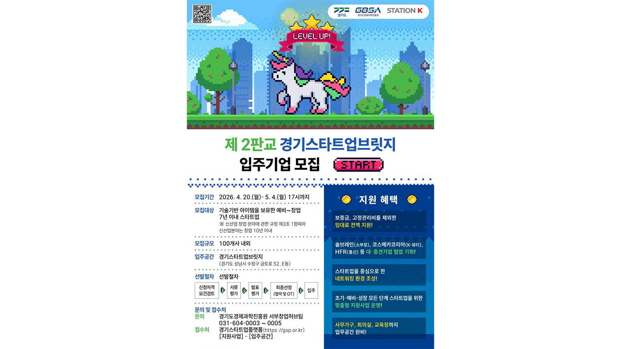 경기도경제과학진흥원(경과원)이 판교 제2테크노밸리에 위치한 민관협력 창업 거점인 '경기스타트업브릿지'에 입주할 유망 스타트업 125곳을 다음 달 4일까지 모집합니다.