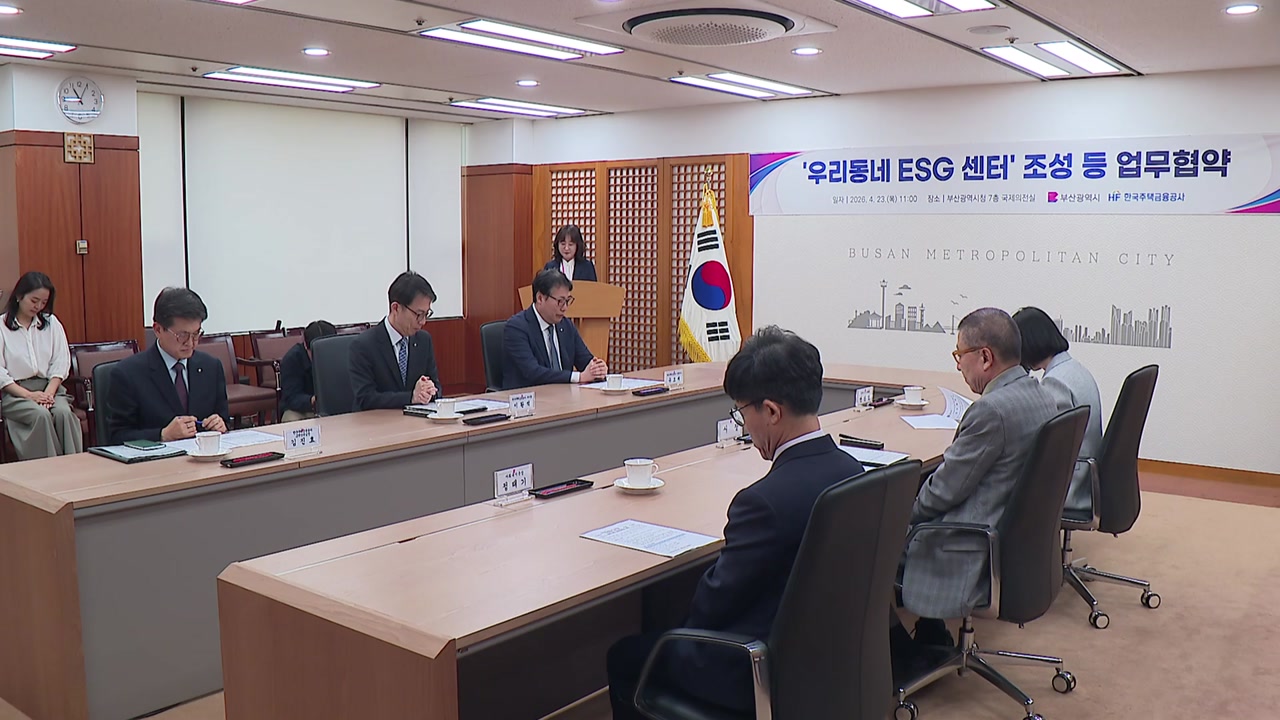 부산시와 한국주택공사가 시청 국제의전실에서 '우리 동네 사회가치경영 센터' 조성 등을 위한 업무협약과 기부금 전달식을 열었습니다.
