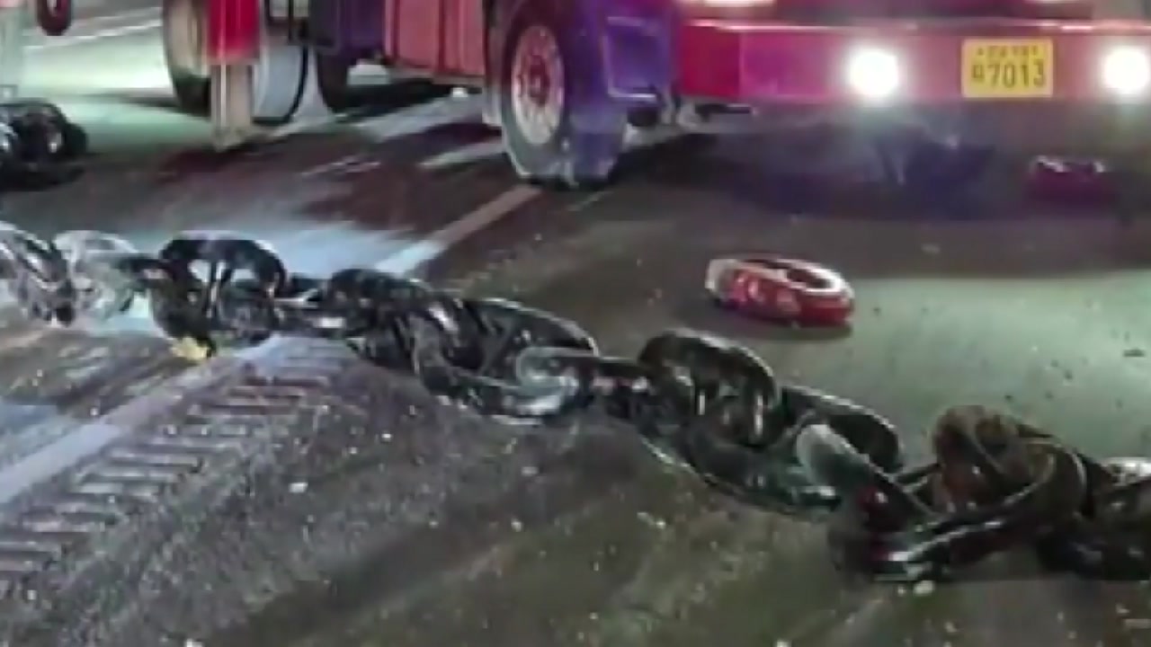 오늘(27일) 새벽 3시 반쯤 전남 장성군 호남고속도로 순천 방향 장성분기점 부근을 달리던 대형 화물차에서 선박용 닻줄이 떨어졌습니다.