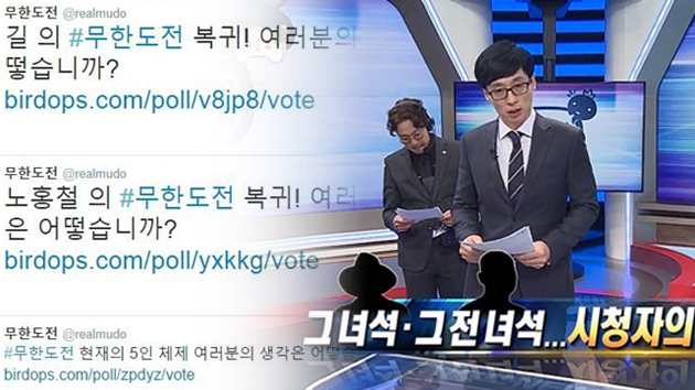 무한도전은 트위터 계정을 통해 '현재 5인 체제 여러분의 생각은 어떻습니까?'를 시작으로 길과 노홍철의 복귀에 대해 찬성, 반대로 투표하는 멘션을 올렸다.
